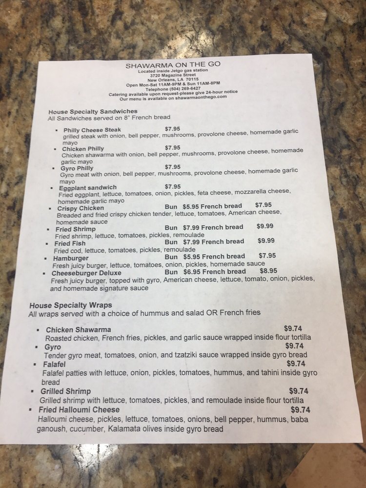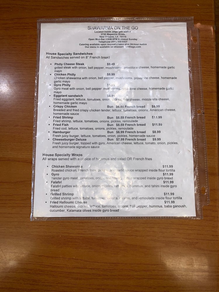 Welcome to Shawarma on the Go, where the flavors of the Middle East meet American flair in a vibrant, casual setting. Located at 3720 Magazine St, New Orleans, this women-owned gem offers a menu rich with options, including generous portions of chicken shawarma, gyro wraps, and fresh hummus, all crafted to provide a delightful dining experience.